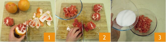 Para preparar a geleia de toranja rosa, comece pela sanitização dos frascos e tampas seguindo as diretrizes fornecidas pelo Ministério da Saúde que você encontra na caixa no final da receita. Enquanto isso, lave e seque as toranjas. Descasque-as ao vivo para eliminar também a parte branca 1 e depois corte a polpa em pedaços 2. Se notar as sementes, elimine-as. Recolha os pedaços de toranja em uma tigela, adicione o açúcar 3