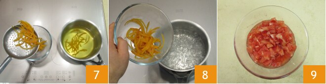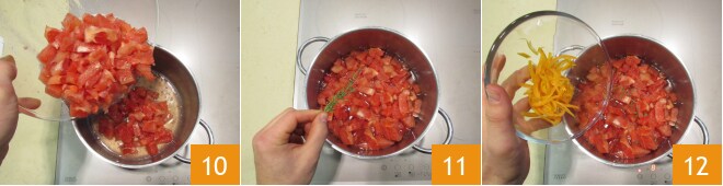 Coloque a polpa em uma panela de aço junto com o líquido que saiu 10, adicione os ramos de tomilho desfolhados 11 e as cascas escaldadas várias vezes 12.