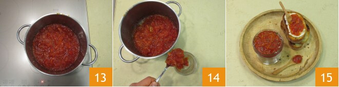 Ligue o fogão em temperatura média-baixa e deixe ferver suavemente por cerca de 40 minutos 13. Nos últimos 5 minutos, deixe em fogo mais alto para secar o líquido em excesso e leve à temperatura de 108° medindo com um termômetro. Então, nesse ponto, transfira a geleia de toranja rosa ainda quente e feche os frascos 14. Consuma quando preferir em pão torrado junto com manteiga 15.
