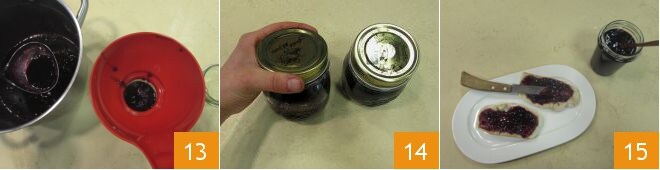 Transfira a geleia ainda quente para os potes previamente higienizados usando um funil para um trabalho mais preciso (nós usamos potes de 300 g) 13 e feche-os 14 tendo cuidado para criar o vácuo (se a tampa no centro fizer um click-clack uma vez que a geleia estiver resfriada, significa que o vácuo não se formou e a geleia não pode ser consumida). Sua geleia de uva preta poderá ser consumida após cerca de 2-3 semanas da realização 15.