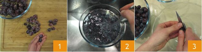 Para preparar a geleia de uva preta, certifique-se de ter tampas novas e potes higienizados (seguindo as diretrizes do Ministério da Saúde mencionadas no final da receita). Então comece retirando as uvas do cacho 1, lave-as cuidadosamente em água corrente 2, escorra-as e retire as sementes internas abrindo cada uva com uma faca pequena 3