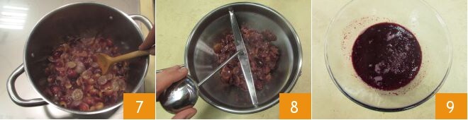 e deixe-as cozinhar em fogo médio por cerca de 20 minutos, tendo cuidado para mexer 7. Uma vez pronto, retire do fogo e passe as uvas pelo passa-verduras 8, extraindo assim o suco e parte da polpa 9.