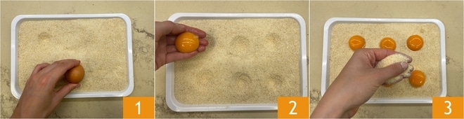 Para preparar a gema frita, a primeira coisa é colocar bastante farinha de rosca em um prato ou bandeja. Em seguida, usando um ovo, crie ninhos, pressionando-o na farinha de rosca 1. Coloque a primeira gema em um dos buracos recém feitos 2 e continue assim para as outras. Cubra novamente com a farinha de rosca 3.