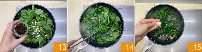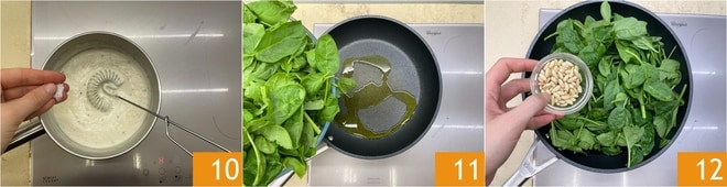 Adicione uma pitada de sal 10, misture e reserve. Passe para os espinafres. Lave-os e seque-os bem. Coloque-os em uma frigideira, onde você já aquecida um pouco de óleo. Adicione os pinhões 12.