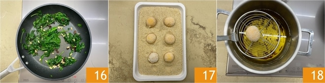 Cozinhe por cerca de 3-4 minutos até que os espinafres fiquem bem murchos 16. Passe para a fritura: coloque o óleo de sementes em uma panela e aqueça até atingir a temperatura de 180°. Retire as gemas do freezer 17 e mergulhe uma de cada vez no óleo quente 18.