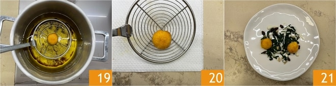Cozinhe por 2 minutos, até que fiquem bem douradas 19. Não prolongue muito o cozimento porque a gema interna deve permanecer macia. Escorra a gema frita do óleo e coloque-a em uma bandeja com papel toalha 20 para remover o excesso de óleo. Agora, sirva colocando os espinafres no fundo, um pouco de molho bechamel e sobre a gema frita 21.