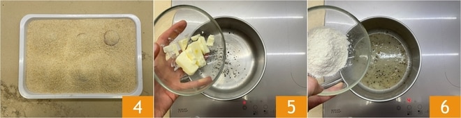 As gemas devem estar bem cobertas; coloque-as no freezer por pelo menos 2 horas 4. Quando as 2 horas estiverem quase completas, você pode começar a preparar o molho bechamel. Em uma panela, adicione uma quantidade generosa de pimenta preta moída e toste-a por alguns minutos em fogo baixo. Adicione a manteiga 5 e deixe derreter, então acrescente a farinha de uma só vez 6.