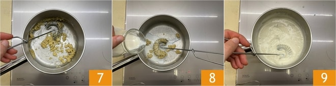 Misture rapidamente com um batedor 7, para obter o roux e cozinhe por alguns minutos. Agora, adicione o leite 8 e continue mexendo. Cozinhe até começar a engrossar 9.