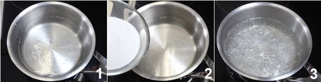 Para preparar os picolés de morango, comece preparando um xarope: coloque a água para aquecer em uma panelinha 1 e adicione o açúcar 2, deixe o açúcar dissolver completamente, desligue o fogo e deixe esfriar 3.