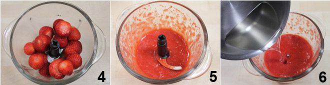 Enquanto o xarope esfria, limpe e lave bem os morangos em água corrente e bata-os no liquidificador 4 até alcançar uma consistência cremosa 5. Adicione o xarope já frio ao purê de morangos 6