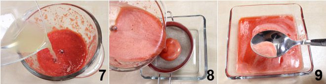 e o suco de meio limão previamente coado 7. Misture bem, coe o composto obtido com uma peneira fina 8 e, caso tenha se formado espuma, remova-a com uma colher 9.