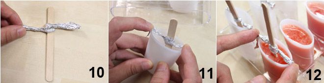 Agora, pegue palitos de sorvete comuns e uma folha de papel alumínio. Forme uma pequena tira, enrole-a em torno do palito 10 e prenda as extremidades nos lados da forma de picolé 11. Isso ajudará a manter o palito centralizado quando você for despejar o líquido na forma. Neste ponto, despeje o composto na forma, deixando 1 cm de espaço da borda 12. Coloque seus picolés de morango no freezer até que estejam solidificados!