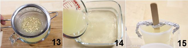 Para preparar os picolés de limão, comece preparando o xarope, usando o mesmo procedimento descrito acima. Enquanto o xarope esfria, esprema os limões até obter 150 g de suco, coe com uma peneira fina 13 e adicione ao xarope já frio 14. Repita a operação do palito também para os picolés de limão, despeje o líquido nas formas 15, lembrando-se de deixar 1 cm de espaço da borda. Coloque-os no freezer até que atinjam uma consistência sólida.
