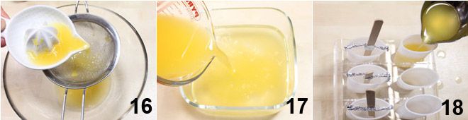 Para preparar os picolés de laranja, comece preparando o xarope, usando o mesmo procedimento descrito acima. Enquanto o xarope esfria, esprema as laranjas e coe o suco com uma peneira fina 16 e adicione ao xarope já frio 17. Repita a operação do palito também para os picolés de laranja, despeje o líquido nas formas 18, lembrando-se de deixar 1 cm de espaço da borda. Coloque-os no freezer até que atinjam uma consistência sólida.