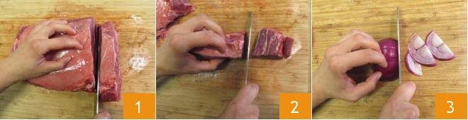 Para preparar o ghormeh sabzi, primeiro corte o pedaço de carne em fatias de 3-4 cm de espessura 1, depois reduza-as a cubos 2. Descasque as cebolas roxas e corte-as em fatias finas 3.