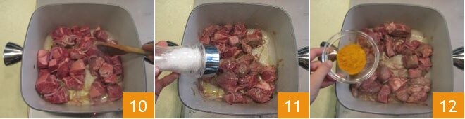 Neste ponto, adicione a carne e deixe dourar em fogo médio, mexendo com uma colher de pau para não grudar 10. Adicione o sal 11 e a cúrcuma 12 e mexa novamente.