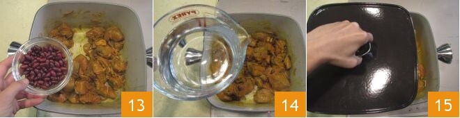 Adicione os feijões secos 13 e 1 litro de água 14, depois tampe 15 e deixe cozinhar por cerca de 20 minutos.