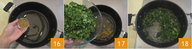 Enquanto isso, aqueça um fio de óleo em outra panela e toste as sementes de feno-grego por alguns minutos 16, depois adicione a mistura de ervas, alho-poró e cebolinha que você reservou 17 e deixe cozinhar em fogo médio durante os 20 minutos de cozimento da carne 18.