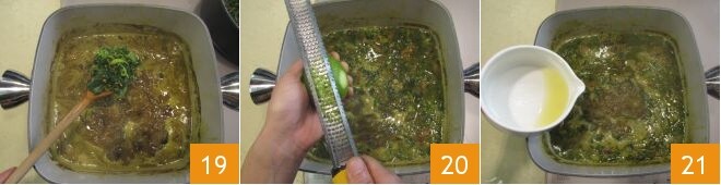 Depois deste tempo, adicione as ervas cozidas dentro da panela com a carne 19, depois acrescente também a casca 20 e o suco de limão 21.