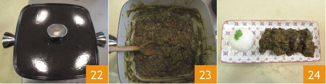 Coloque a tampa 22 e cozinhe em fogo médio-baixo por pelo menos 3 horas, até que o ensopado fique denso e cremoso 23. Sirva seu ghormeh sabzi acompanhado de arroz basmati cozido no vapor 24!