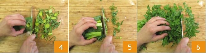 Lave e corte finamente a parte verde do alho-poró 4, depois faça o mesmo com a parte verde das cebolinhas 5. Finalmente, lave e pique tanto a salsa 6