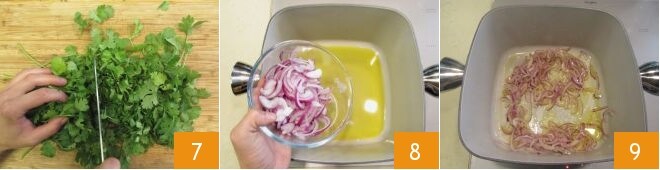 quanto o coentro 7 e reserve a mistura de ervas, alho-poró e cebolinha em uma tigela. Aqueça o óleo em uma panela grande, adicione a cebola 8 e deixe dourar por alguns minutos até murchar 9.