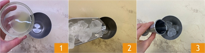 Para preparar o Gin Fizz, despeje o suco de limão no shaker 1, em seguida, adicione bastante gelo 2 e acrescente o gin, medindo com o jigger diretamente no shaker 3. Adicione também o xarope de açúcar.