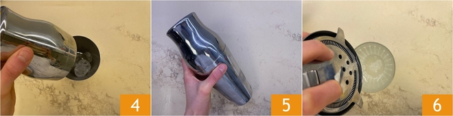 Feche com a parte superior e certifique-se de que esteja bem selado 4, depois agite energicamente por alguns segundos, até que o shaker esteja bem frio entre as mãos 5. Neste ponto, coe o coquetel com o strainer e despeje no copo de servir 6.