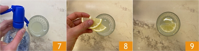 Complete adicionando a soda diretamente no copo 7. Decore finalmente com duas fatias de limão 8 e sirva imediatamente o Gin Fizz sem gelo 9.