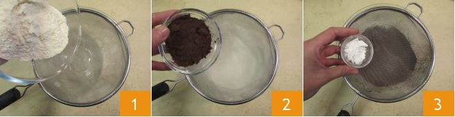 Para preparar o bolo gingerbread bundt, derreta primeiro o chocolate amargo no micro-ondas ou em banho-maria, depois deixe esfriar. Em uma tigela grande, peneire a farinha 1, o cacau 2 e o fermento.