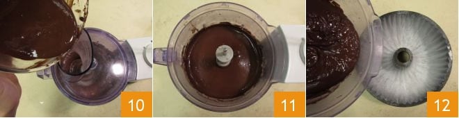 Enquanto o liquidificador está em funcionamento, despeje o chocolate derretido em fio 10. Uma vez obtida uma mistura homogênea, pare o liquidificador 11. Unte e enfarinhe uma forma de bolo com diâmetro de 24 cm, despeje a massa nela 12.
