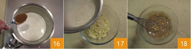 Em uma panela, aqueça o creme de leite com uma colher de chá de canela 16 e depois despeje-o bem quente sobre o chocolate branco picado 17, mexa com um batedor para derreter o chocolate 18 e obter um molho liso e homogêneo.