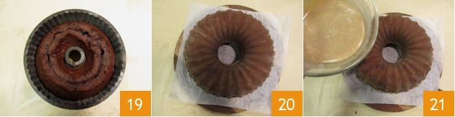 Enquanto isso, o bolo estará assado, retire do forno 19, deixe esfriar e depois desenforme sobre uma tábua coberta com papel manteiga ou um prato 20. Despeje a cobertura de chocolate branco sobre o bolo 21.