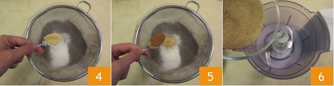 Tempere os ingredientes secos com o gengibre em pó, a canela em pó 5 e uma pitada de noz-moscada ralada. No copo do liquidificador, coloque o açúcar mascavo 6.