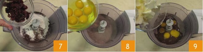 Adicione também os ingredientes secos peneirados anteriormente e 50 g de cranberries secas 7. Dê uma primeira batida para misturar. Agora, incorpore os ovos 8 e a manteiga cortada em pedaços 9, acione novamente o liquidificador para bater os ingredientes.