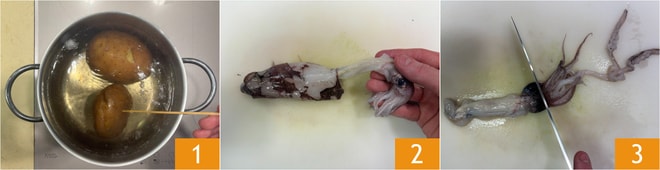 Para preparar os gnocchetti ao nero de sépia com ragú de sépias, primeiro cozinhe as batatas em água fervente com sal, o que levará cerca de 30-40 minutos 1. Faça o teste do palito para verificar quando estão cozidas, depois escorra-as e deixe-as esfriar completamente. Enquanto isso, limpe as sépias. Retire a cabeça e as vísceras 2, depois elimine o bico, localizado no centro dos tentáculos. Separe o corpo dos tentáculos e reserve estes últimos 3.