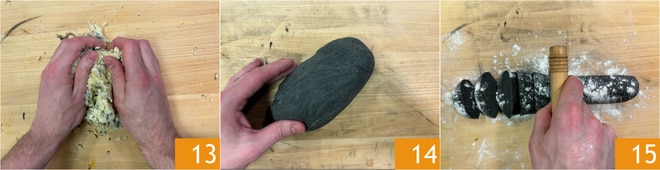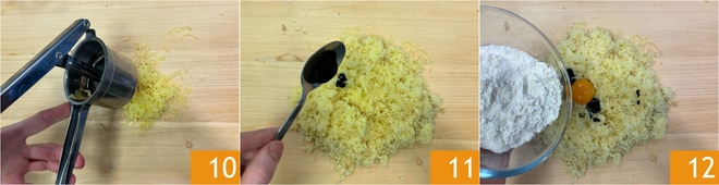 Enquanto isso, em uma superfície de trabalho, amasse as batatas 10, adicione o nero de sépia 11, uma gema e a farinha 12.