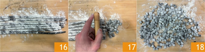 Com cada uma dessas porções, forme rolinhos grossos de cerca de 2 cm 16. Enfarinhe bem para que não grudem entre si, depois corte em pedaços com um cortador 17 para formar os gnocchetti 18.