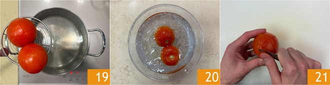 Depois de lavar os tomates, faça um corte em cruz no fundo e escalde-os por 2 minutos 19. Em seguida, mergulhe-os em água com gelo por mais 2 minutos 20 e remova a pele 21, que agora sairá facilmente.