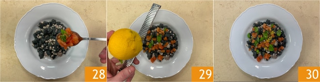 Emprate os gnocchetti e finalize com os cubinhos de tomate 28, uma colher do fundo de cozimento das sépias, folhas de manjericão e raspas de limão 29. Os gnocchetti ao nero de sépia com ragú de sépias estão prontos para serem servidos 30!