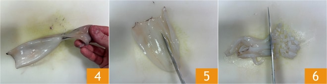 Elimine a pele 4 e corte o corpo e os tentáculos em pequenos cubos 5 6.