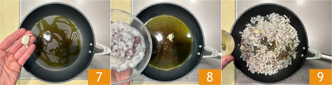 Em uma frigideira, coloque um fio de óleo e acrescente o alho amassado 7, depois refogue por alguns minutos. Adicione as sépias cortadas 8 e cozinhe por 5 minutos, em fogo médio. Regue com vinho branco 9 e cozinhe por 20 minutos, adicionando um pouco de água se necessário.