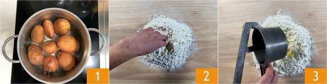 Para preparar os nhoques com gorgonzola e nozes, comece pela massa: coloque as batatas em água fria e deixe ferver até ficarem macias 1. Despeje a farinha na superfície de trabalho e faça um buraco no centro 2, depois adicione as batatas ainda quentes passadas pelo espremedor 3.