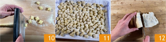 Divida os rolinhos em pequenos pedaços de 1 cm 10 com uma espátula ou faca. À medida que formar os nhoques, coloque-os sobre uma bandeja com um pano enfarinhado 11. Coloque uma panela de água no fogo e adicione sal quando ferver. Corte o gorgonzola em pedaços 12.