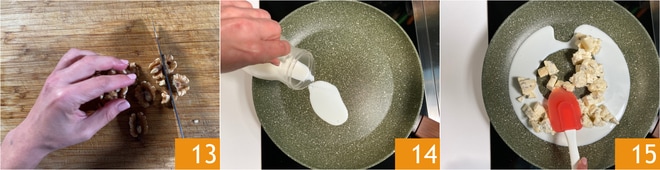 Triture as nozes 13. Aqueça o leite em fogo baixo em uma frigideira 14, adicione o gorgonzola e mexa até derreter 15.