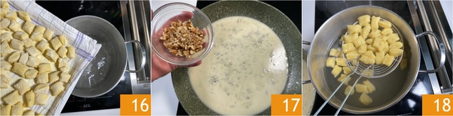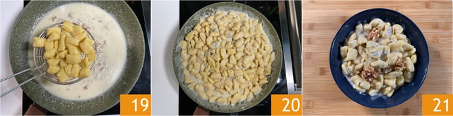 Cozinhe os nhoques em água fervente 16 e espere subirem à superfície. Enquanto isso, adicione as nozes ao tempero 17. Escorra os nhoques 18.