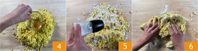 Adicione também o ovo inteiro 4, o sal 5 e comece a amassar com as mãos 6 até obter uma massa firme e compacta.