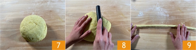 Forme uma massa homogênea 7, depois retire porções 8 e faça rolinhos 9, polvilhe com sêmola.