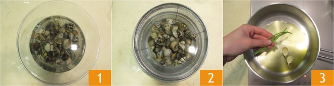 Quando o alho estiver dourado, adicione as amêijoas escorridas 4, cubra imediatamente com uma tampa 5 e deixe que as amêijoas se abram por alguns minutos em fogo médio, agitando de vez em quando. Desligue o fogo, descarte o alho 6 e as hastes da salsinha.