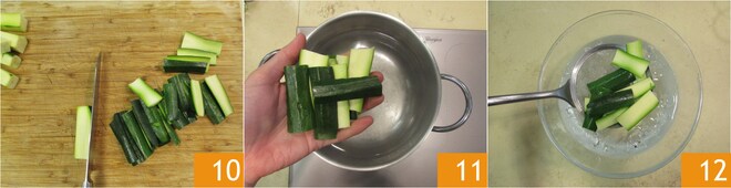 Corte-as em palitos descartando a parte branca 10 de modo a obter a parte externa, a verde. Leve uma panela de água salgada para ferver (a mesma em que vai cozinhar os gnocchetti). Cozinhe 11 por cerca de 30 segundos as abobrinhas. Escorra-as imediatamente em água e gelo 12 para preservar a cor.